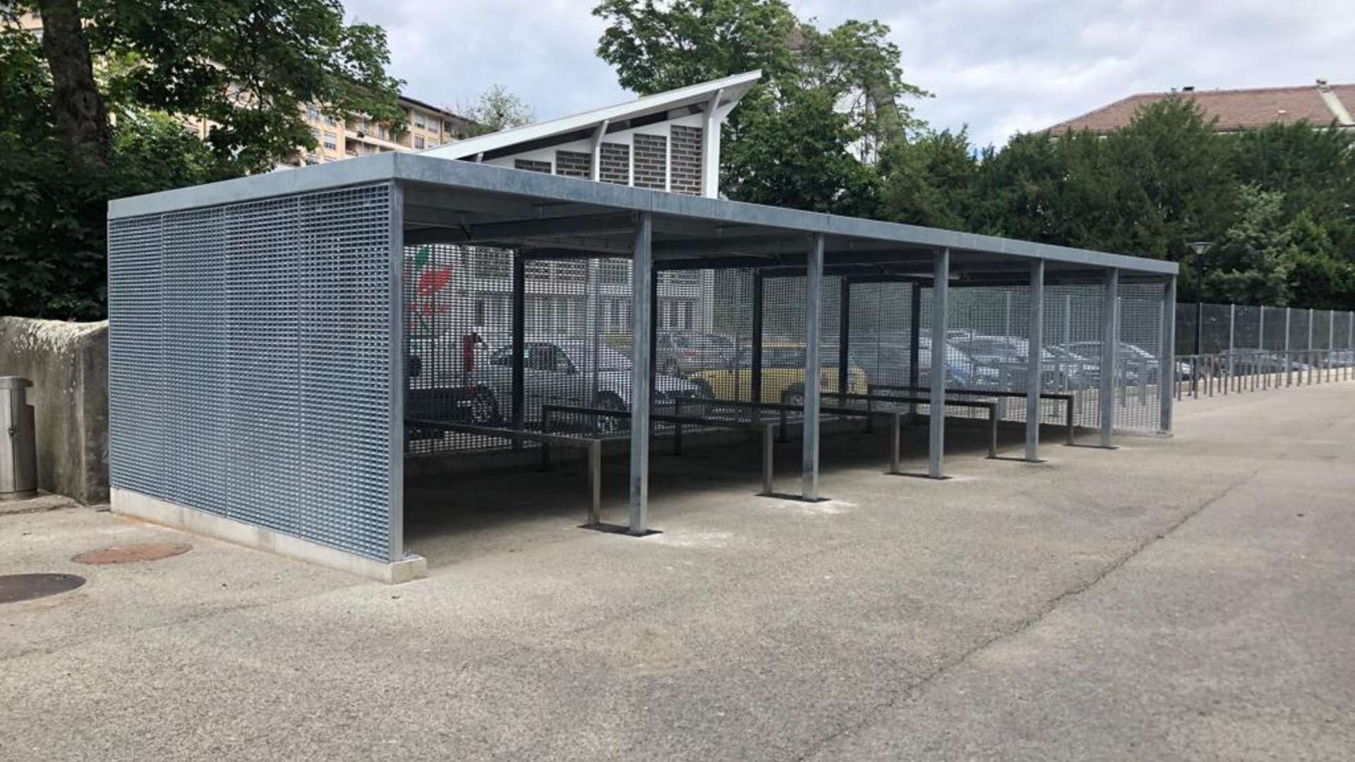 FAHRRADUNTERSTAND AUS LAMMELLENROST TECHNISCHE DATEN Produkt: Lamellenrost, Stahl verzinktTragstab: 40/2 mmMaschenweite: 99 x 33 mmWinkel: 45° In Genf wurden für mehrere Velounterstände nach einer Lösung gesucht, welche luftdurchlässig ist sowie
