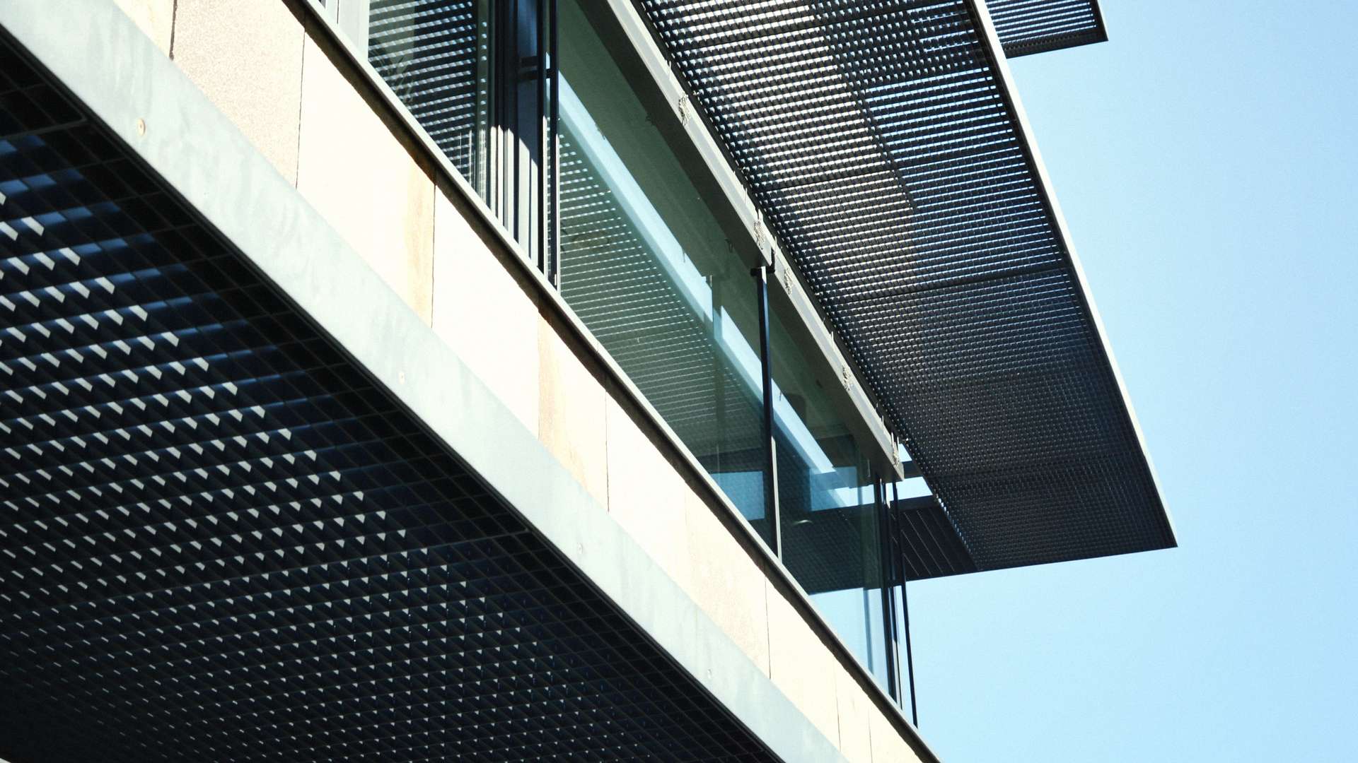 DESIGNELEMENT ALS SICHTSCHUTZ TECHNISCHE DATEN Produkt: Lamellenroste duplexiertOberfläche: Stahl feuerverzinkt und beschichtet in NCS S 4020-B30GMaschenweite: 44 x 22 mmSchrägstellung: 45 GradRostgrösse: 2290 x 735 mmGeländer: Staketengeländer feuerverzinkt und beschichtet